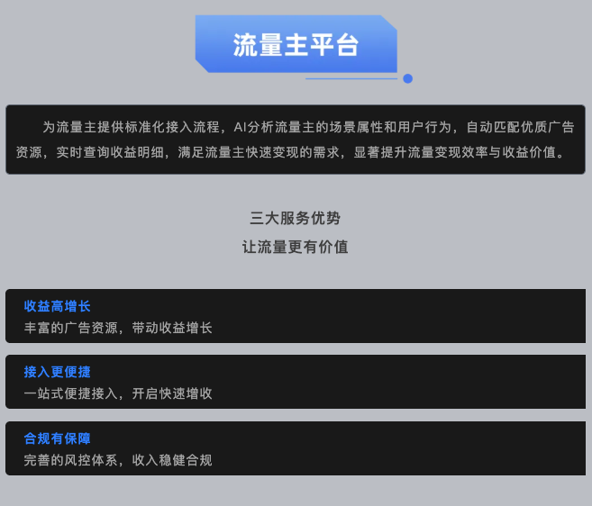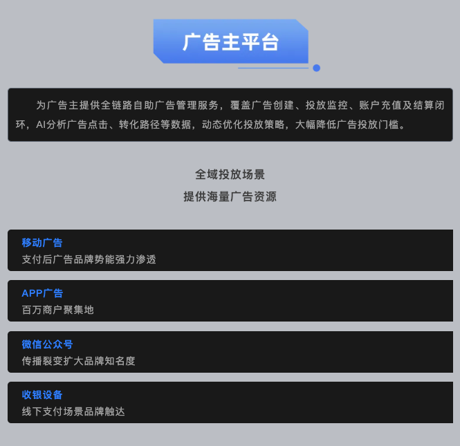 星驿付与慧徕店敏锐洞察行业趋势,整合自身流量资源,依托星驿支付专属大模型,自研大数据分析平台与自动化投放体系,打造慧徕店广告平台,聚合广告主平台、流量主平台两大核心模块,促成广告主投放需求和流量主变现需求的自动化、精准化对接,实现多方共赢。