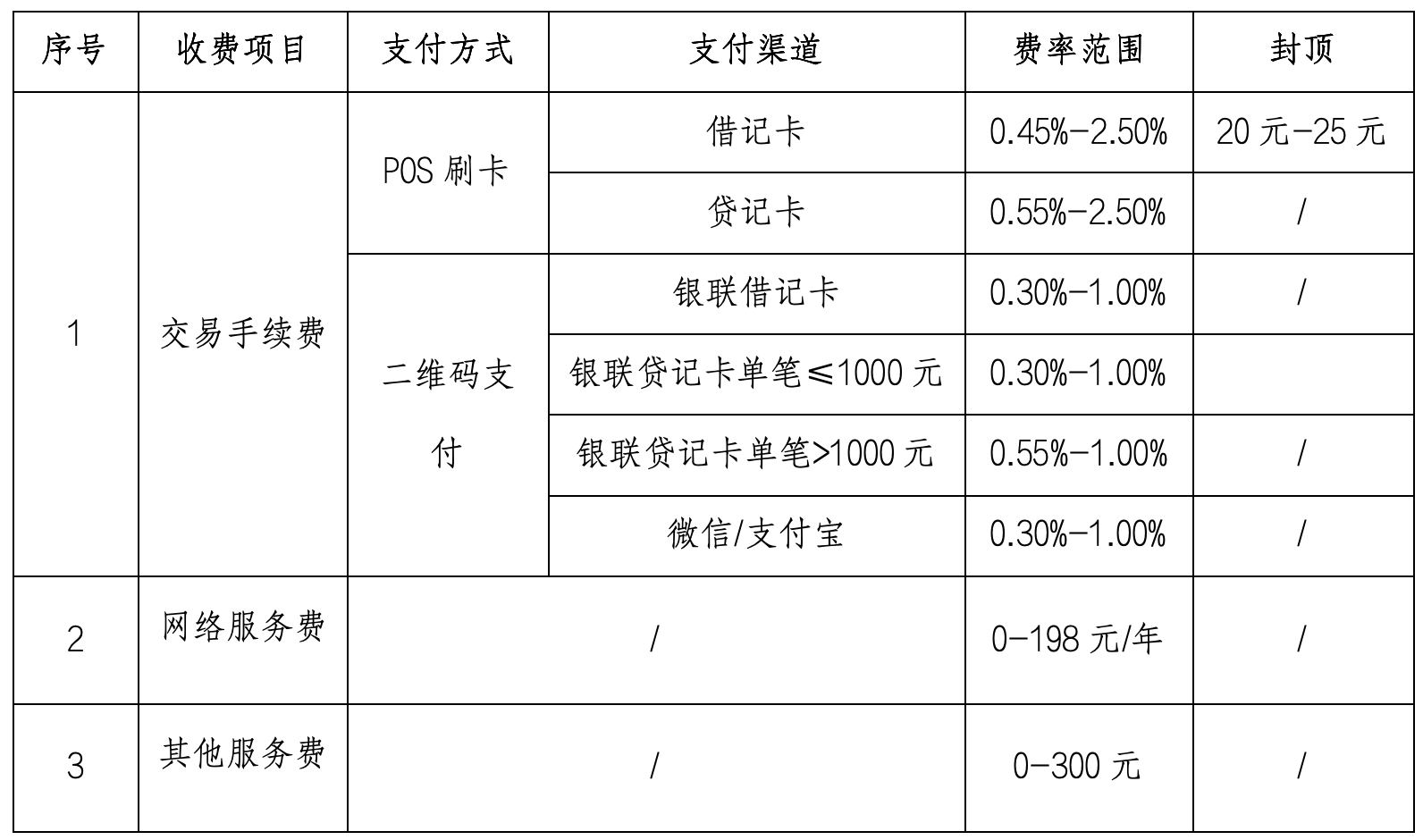 根据《非银行支付机构监督管理条例》(中华人民共和国国务院令第768号)和《国家发展改革委 中国人民银行 关于完善银行卡刷卡手续费定价机制的通知》(发改价格[2016]557号)等法律法规及监管要求,我公司将收费项目与收费标准进行如下公示:
