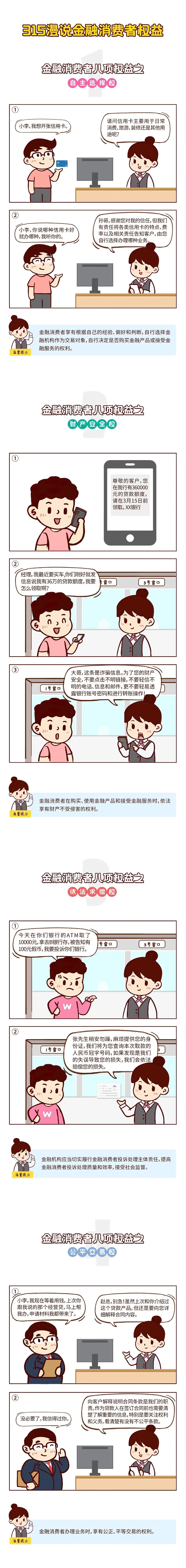 金融消费与我们的生活息息相关。3·15是消费者权益日,你知道作为金融消费者享有哪些基本权益吗?下面,为大家带来“金融消保3·15”——漫说金融消费者八大权益 ,长图通过一系列日常金融消费的小场景,学习金融消费者享有的财产安全权、知情权、自主选择权等八项权益。提升金融素养,保障金融权益,助力美好生活。